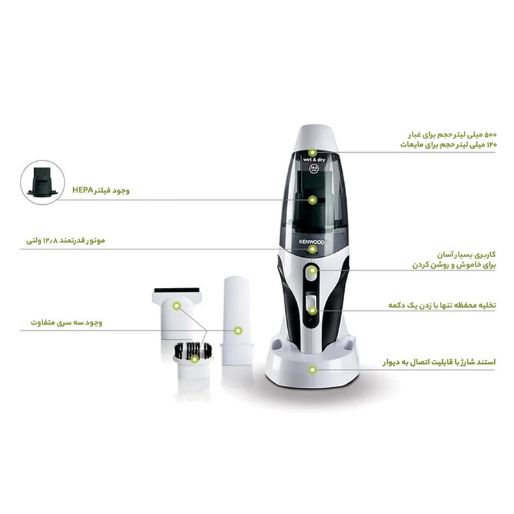 جاروشارژی آب و خاک مدل HVP19 با قدرت مکش 14.8 ولت توانایی کافی برای جمع آوری گرد و غبار و مایعات روی زمین داراست.مخزن جاروشارژی کنوود مدل HVP19 برای جمع آوری 0.5 لیتر گرد و غبار و 0.12 لیتر مایعات حجم مناسبی را یرای یک جاروشارژی داراست.قطعات جاروشارژی برای نظافت به راحتی از هم جدا می شود.