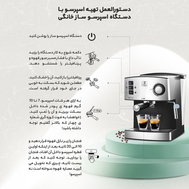 اسپرسوساز زیگما مدل rl-222 اسپرسوساز زیگما مدل RL-222 یک دستگاه اسپرسوساز اقتصادی است که با توجه به قابلیتهای منحصر به فرد خود، طرفداران زیادی دارد. این دستگاه اسپرسوساز قادر است تا انواع مختلفی از نوشیدنیهای قهوه از جمله اسپرسو، کافه لاته، کاپوچینو و موکا را تهیه کند. همچنین با مخزن آب با حجم ۱.۶ لیتر، قابلیت استفاده از پودر قهوه و تنظیم میزان بخار دستی میتوان گفت که این دستگاه اسپرسوساز دارای ویژگیهای منحصر به فردی است. منظور از نوشیدنیهای قهوه از جمله اسپرسو، کافه لاته، کاپوچینو و موکا را دارد. مشخصات اسپرسوساز زیگما مدل rl-222 دستگاه اسپرسوساز زیگما مدل rl-22 با توان مصرفی ۸۵۰ وات، از نظر قدرت مصرفی یکی از دستگاههای کارآمد و اقتصادی برای تهیه قهوه محسوب میشود. این توان برای تهیه انواع نوشیدنیهای اسپرسو، کافه لاته، موکا و کاپوچینو کافی است و همچنین به دلیل کممصرف بودن، برق مصرفی را بهینه میکند. دستگاه اسپرسوساز زیگما مدل rl-22 دارای یک مخزن آب با ظرفیت ۱.۶ لیتر است که این مقدار آب کافی برای تهیه چندین فنجان قهوه یا نوشیدنی دلخواه فراهم میکند. دستگاه اسپرسوساز زیگما مدل rl-22 از قابلیت استفاده از پودر قهوه هم برخوردار است که این امکان به کاربران این امکان را میدهد تا با تنوع بیشتری در نوشیدنیهای خود انتخاب کنند. دستگاه اسپرسوساز زیگما مدل rl-22 دارای قابلیت تنظیم میزان بخار دستی است که این ویژگی به کاربران اجازه میدهد تا بر اساس نیاز خود، میزان بخار را به دلخواه تنظیم کنند. دستگاه اسپرسوساز زیگما مدل rl-22 دارای سیستم ایمنی و خاموشی خودکار است این سیستم باعث میشود که در صورت عدم استفاده به مدت زمان طولانی دستگاه بهطور خودکار خاموش شود و از هدر رفتن انرژی جلوگیری کند. اسپرسو ساز زیگما ساخت کدام کشور است ؟ این اسپرسو ساز توسط کشور ایتالیا تولید میشود. کشور ایتالیا به عنوان یکی از کشورهای پیشرو در تولید انواع مختلف قهوه سازها شناخته میشود و با کیفیت بالای محصولاتش مورد توجه بسیاری از مشتریان قرار گرفته است. نمایندگیهای این کشور در سراسر جهان قرار دارد و مشتریان میتوانند از طریق این نمایندگیها اقدام به خرید و خدمات پس از فروش محصولات این برند کنید. طرز کار با اسپرسوساز زیگما مدل rl ۲۲ ابتدا برای استفاده از این دستگاه، قهوه خورده را در مخزن قرار داده و سپس آب را به دستگاه میریزید. سپس دکمه روشن و خاموش را فشار داده و منتظر میمانید تا دستگاه گرم شود. وقتی دستگاه آماده باشد، قهوه خورده را فشار داده و منتظر میمانید تا قهوه در فنجان شیشهای سرو شود. در نهایت، با توجه به نیاز خود، میتوانید قهوه را با شکر یا شیر تزئین و مزه دلخواه خود را اضافه کنید. به این ترتیب، میتوانید به راحتی و با کیفیت بالا قهوه اسپرسو درست کنید و از مزه و عطر خوشمزه آن لذت ببرید. بهترین دستگاه اسپرسو ساز خانگی با توجه به قابلیتهای منحصر به فرد دستگاه اسپرسوساز زیگما مدل rl-22، این دستگاه به عنوان یک اسپرسوساز اقتصادی و کاربردی مطرح میشود. این دستگاه قادر به تهیه سریع و آسان قهوه در خانه یا محل کار است و با قیمتی منطقی و معقول، قابلیت استفاده از پودر قهوه و تنظیم میزان بخار دستی را فراهم میکند. همچنین، با داشتن سیستم ایمنی و خاموشی خودکار، این دستگاه امنیت کاربر را تضمین میکند و از هرگونه حادثه احتمالی جلوگیری میکند. اسپرسوساز زیگما مدل rl-222 دیجی کالا با توجه به امکانات گسترده، قابلیت تهیه انواع نوشیدنیهای قهوه و همچنین دارا بودن دو عدد نازل قهوه، میتوان نتیجه گرفت که ارزش اقتصادی اسپرسوساز زیگما مدل rl-22 در مقایسه با دستگاههای دیگر بسیار بالا است. این دستگاه با توجه به امکاناتی که ارائه میدهد، به عنوان یک گزینه مناسب و اقتصادی برای تهیه قهوه در خانه یا محل کار معرفی شده است. نتیجه گیری با توجه به مشخصات فنی، قابلیتهای تهیه نوشیدنی و قابلیتهای منحصر به فرد اسپرسوساز زیگما مدل rl-22، میتوان نتیجه گرفت که این دستگاه یک اسپرسوساز اقتصادی و