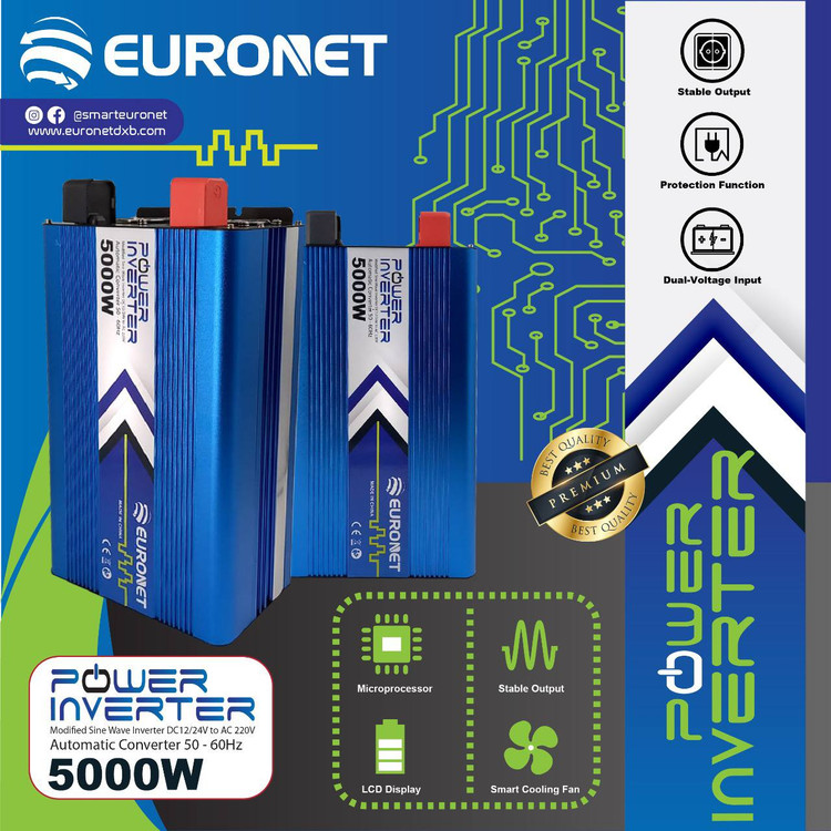 از این جهت وجود وسیله ایی مثل اینورتر این امکان را به ما میدهد تا براحتی برق خوردو را به برق شهری تبدیل کنیم. یعنی تبدیل برق 12 و 24 ولت به 220 ولت شهری است. مبدل برق خودرو 5000 وات 12/24 ولت به 220 ولت برند یورونت از اینورترهای بسیار خوشنام برای تبدیل برق 12 ولت خودرو به برق 220 ولت شهر میباشد. این یک اینورتر با طراحی منحصر به فرد می باشد و قادر است ولتاژ باتری را به صورت اتوماتیک شناسایی کرده و برای هر دو حالت 12 یا 24 ولت مورد استفاده قرار گیرد. نمایشگر گرافیکی پیشرفته ای دارد که پارامترهای اصلی مورد نیاز برای کنترل ورودی و خروجی شامل ولتاژ باتری، ولتاژ خروجی و توان مصرفی را نمتیش میدهد.